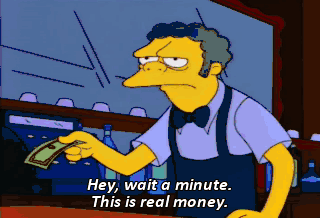 Hey, wait a minute. This is real money. Yeah. My wife is rakin' it in. Greetings, Homer. Hey, Fat Tony. You still with the Mafia?