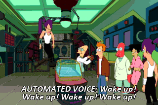 AUTOMATED VOICE: Wake up! Wake up! Wake up! Wake up! (HORNS BLOWING) Wake up! Wake up! Wake up! Wake up!