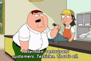 A ttention, restaurant customers. Testicles. That is all. Give me that. Sorry, folks. Oh, my God. Is that what my voice sounds like?