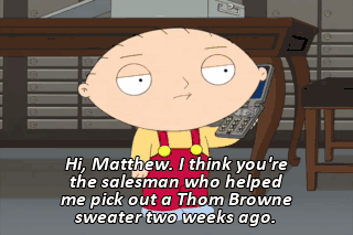 Hi, Matthew. I think you're the salesman who helped me pick out a Thom Browne sweater two weeks ago.