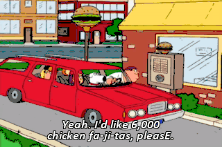 Yeah. I'd like 6,000 chicken fa-ji-tas, pleasE.