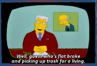 Well, guess who's flat broke and picking up trash for a living. Please be Flanders. Please be Flanders. Please be Flanders.