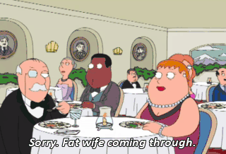 Sorry. Fat wife coming through. Sorry. Sorry. Excuse me. Fat wife. Oh, hold on a sec. All right, bring her through. Peter, stop it. For God's sake, you're embarrassing me.