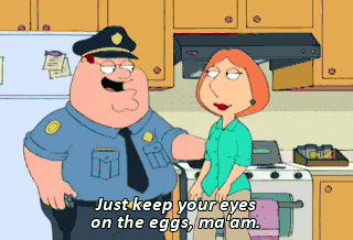 Just keep your eyes on the eggs, ma'am. (LAUGHING) Yes, Officer. - You are such a dirty cop. - Don't break those yolks, ma'am. Oh, my God, Lois, I hit you. I know. Now stick your finger in there and twist it.