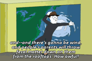 and--and there's gonna be wind, and people's parents will throw fecal matter down on them from the rooftops. How awful!