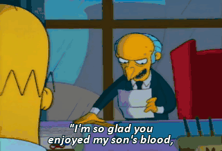 "I'm so glad you enjoyed my son's blood, and your card was just great." Why, Simpson, you've made my day. You're a true gentleman.