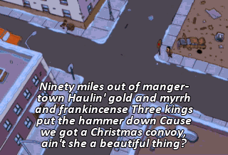 Ninety miles out of manger-town Haulin' gold and myrrh and frankincense Three kings put the hammer down Cause we got a Christmas convoy, ain't she a beautiful thing?