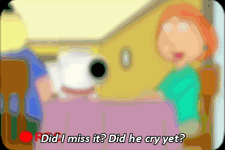 Did I miss it? Did he cry yet? Oh, come on, dog. Cry for me. There, there you are. Oh, yeah. Cry for Stewie.
