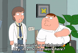Wow, you're a real doctor? Hey, does Scrubs work here? I love that guy. I wanna meet Scrubs, and I wanna meet black Scrubs, too.