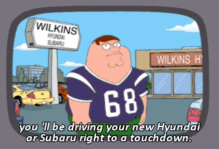 you 'll be driving your new Hyundai or Subaru right to a touchdown. (PETER SINGING JINGLE)