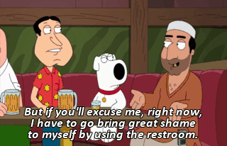 But if you'll excuse me, right now, I have to go bring great shame to myself by using the restroom.
