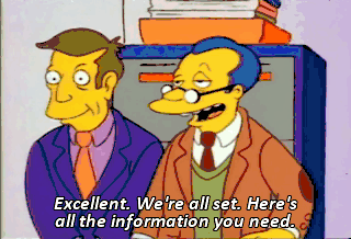 Excellent. We're all set. Here's all the information you need. Show up around nine-ish. Mr. and Mrs. Simpson, congratulations once again.