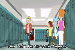 Hey, Toby. I'm Tiny Rick. I'm new. Hey oh -- Go easy on me. Ha ha. Just kiddin'. Hey, I like your straightforward style and that lab coat's pretty cool. Summer. He knows my name!