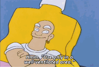 Hmm. "Use only in a well-ventilated area." Shove it, buddy. Whoo! Ahh!