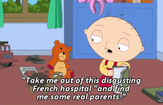 "Take me out of this disgusting French hospital "and find me some real parents." (GRUNTS IN PAIN) Paper cut!