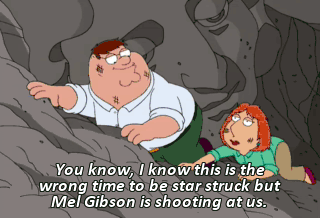You know, I know this is the wrong time to be star struck but Mel Gibson is shooting at us. Peter, help! Oh, man. I'm coming, Lois. Hey, Lois, look. I'm a booger. Peter, for God's sake!