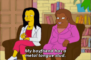 My boyfriend has a metal tongue stud. Who cares what's on his tongue, long as he's a stud where it counts. I'm talkin' downtown. Marge, what was Homer like before he broke his jaw?