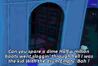 Can you spare a dime Half a million boots went sloggin' through hell I was the kid With the drum Empty. Bah ! Waah ! Ah, just resting my eyes. Oh. Holy moly ! 9:30.