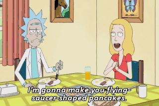 I'm gonna make you flying-saucer-shaped pancakes. Oh, t-t-there's no need to do that, Beth. Regular pancakes are fine.