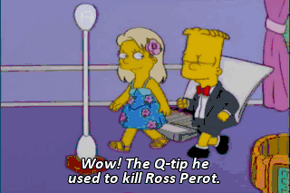 Wow! The Q-tip he used to kill Ross Perot. Oh, everything in your house is so cool. What's your house like? Oh, it's okay. My bed is stuffed with hay. Bart, you're so funny. Yeah.