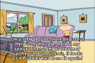 I'm a little teapot short and stout Here is my handle, here is my spout When I get all steamed up, hear me shout Lois, it looks as if Puddles has done it again! Goodness, he's wet everything.