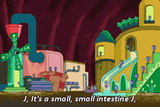 J, It's a small, small intestine J, It goes on like this for miles. Then we get to the large intestine! Shh! I hear something.