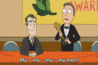 My -- my -- my -- my man! Aah! What the hell?! No, Jerry?! Dad! What are you doing here? W-why are you dressed like a waiter? Screw it. We don't have time. Come on.
