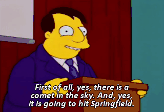 First of all, yes, there is a comet in the sky. And, yes, it is going to hit Springfield. You, uh, don't need to applaud that. Now, here's what we think the impact might look like. Show them, jerry.