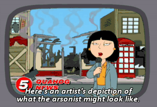 Here's an artist's depiction of what the arsonist might look like. Anyone with information regarding this suspect should contact quahog police immediately.