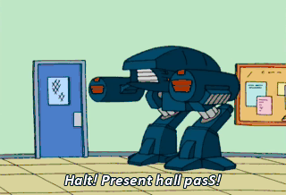 Halt! Present hall pasS! Right here. Second request. Present hall pasS. But... Right here! SecurITy bReach! Security breach!