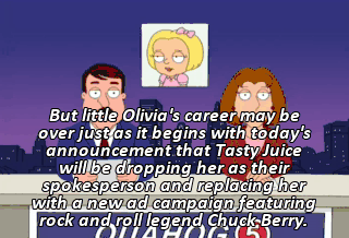 But little Olivia's career may be over just as it begins with today's announcement that Tasty Juice will be dropping her as their spokesperson and replacing her with a new ad campaign featuring rock and roll legend Chuck Berry.