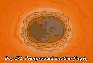 Day 171. I've sprouted another finger, counting the one from yesterday. I'm up to 11. "As the months of solitude passed, I began to go insane.
