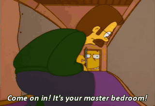Come on in! It's your master bedroom! Ow! My nose! Well, I've seen about enough. So, Flanders, what do you think of the house that love built? Aw, shoot!