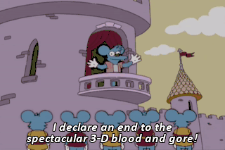 I declare an end to the spectacular 3-D blood and gore! ALL: Yay!