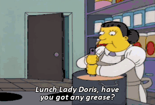 Lunch Lady Doris, have you got any grease? Yes. Yes, we do. Then grease me up, woman! Okeydokey.