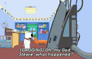 (GAGGING) Oh, my God, Stewie, what happened? None of your fucking business what happened! Geez, you kiss your mother with that mouth? Do you like Coldplay?