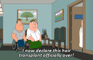 I now declare this hair transplant officially over! Hey, hey, hey! Hey, he's back! You look great, Quagmire. (BEEPING) Oh, my God. One of my patients on Two has been shot.