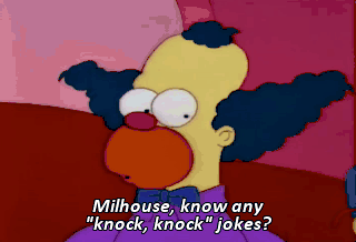 Milhouse, know any "knock, knock" jokes? I want to go home. Homer, maybe you better take Milhouse home.