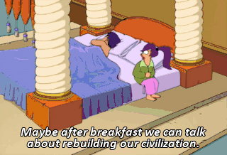 Maybe after breakfast we can talk about rebuilding our civilization. Mmm. Great pancakes, Leela. Yeah, they'll come in handy if I need to cover any tiny manholes.