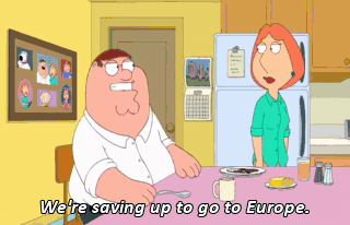 We're saving up to go to Europe. Peter, we went to Europe. You didn't like it. Oh, my God, it's beautiful. My TV isn't here. Let's go home.