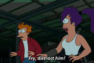 Fry, distract him! Hey, Project Satan, over here! I'm a blind pedestrian! 20 points! Oh no! There's no exhaust pipe.