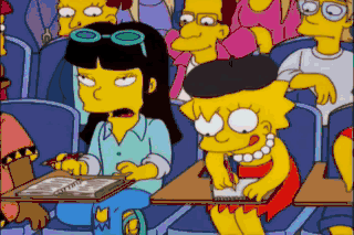 Hey, Mister! Put the cartoon back on! I'm sorry, boys. We don't allow children in this class. What about Lisa? She's only eight! Lisa, did you lie to us?