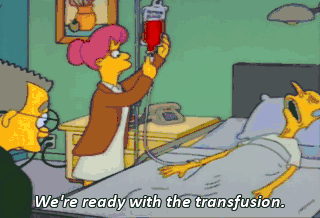 We're ready with the transfusion. Smithers, I'm not going to make it. I want to dictate my epitaph. Go ahead. Charles Montgomery Burns.