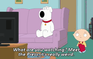What are you watching? Meet the Press, it's really weird. In reverse time, the Republicans make outrageous statements and then the host asks an unrelated question. Global warming is a myth.