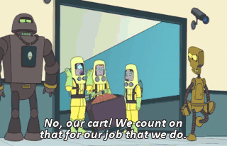 No, our cart! We count on that for our job that we do. Pee-u. Joey, you got fingers, right? Help me fix the lady's wheel.