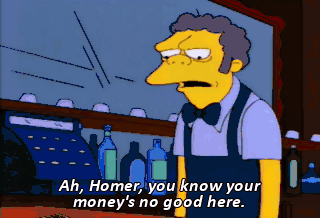 Ah, Homer, you know your money's no good here. Hey, wait a minute. This is real money. Yeah. My wife is rakin' it in. Greetings, Homer.