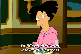 You finish that word, you kill your parents! Low wine level detected. Thank you. Stop seducing him, you hussy! Dad! I'm attracted to Bender, not this emotionless wine bucket!