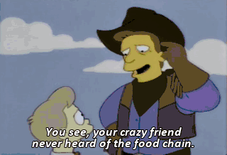 You see, your crazy friend never heard of the food chain. just ask this scientician. Uh-- He'll tell you that in nature one creature invariably eats another to survive.