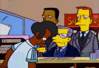 Oh! Fired after all these years of loyal service. I don't want to live anymore! Oh! Give me that wiener! No! I don't want to live, sir! Give me that wiener! No, Apu! It's not worth it! What do I do now?