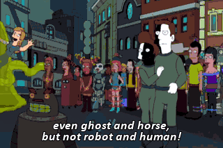 even ghost and horse, but not robot and human! (ALL BOOING) (BOOING) That's why we're introducing this ballot initiative to legalize robosexual marriage!